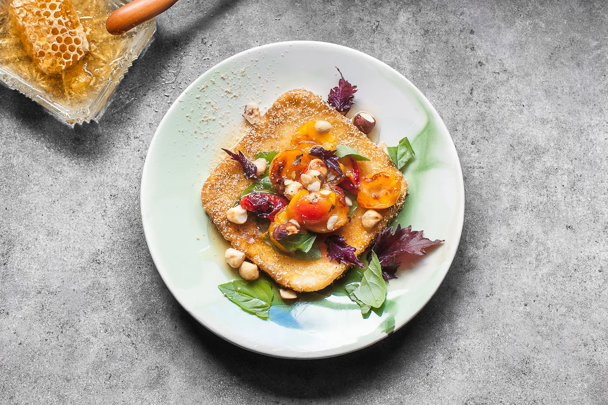 SAGANAKI WITH PLUM, BASIL AND HONEY