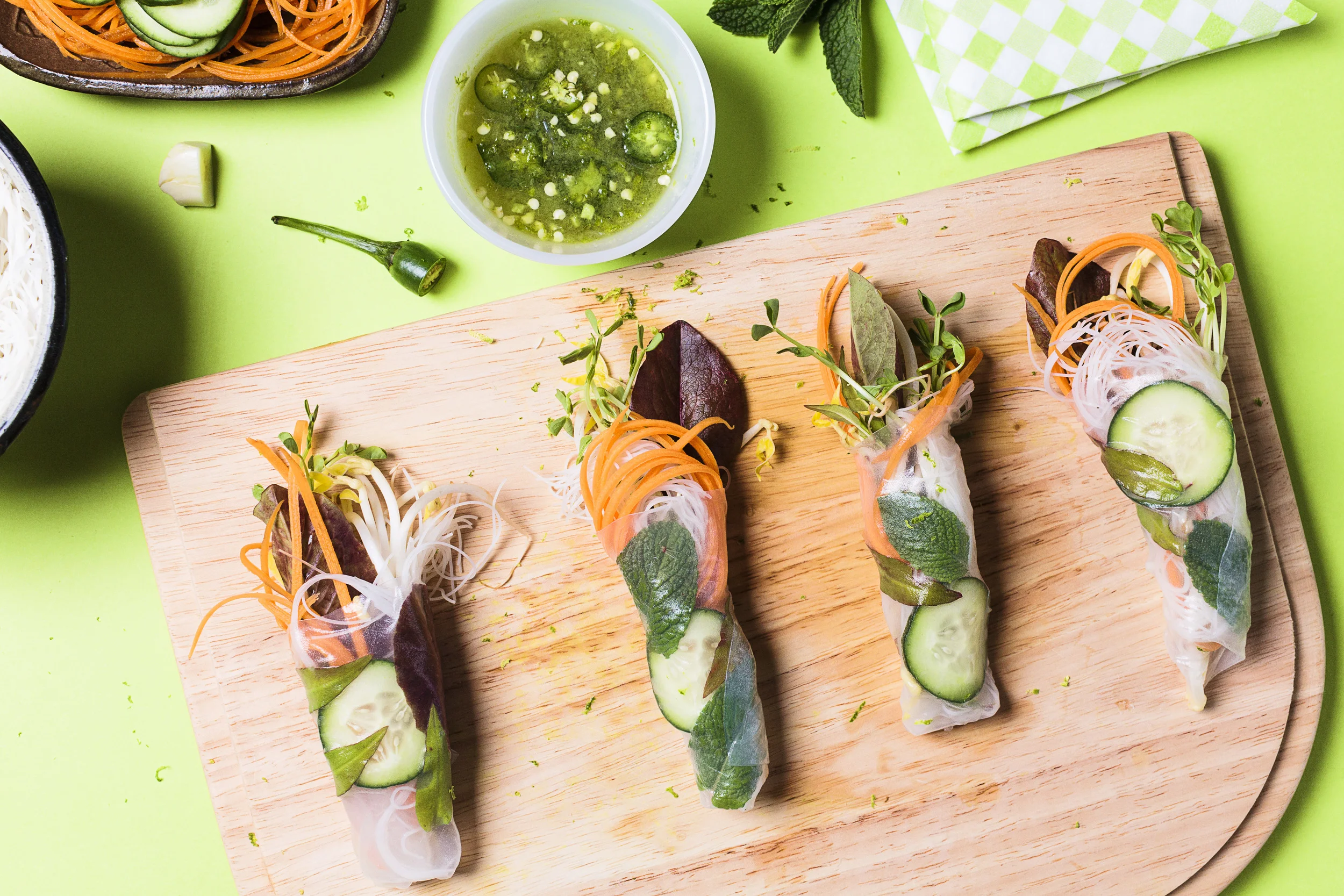 Rice Paper Rolls w Green Chilli Dipping Sauce. Recipe and styling by Cle-ann, photo by Hugh Adams.