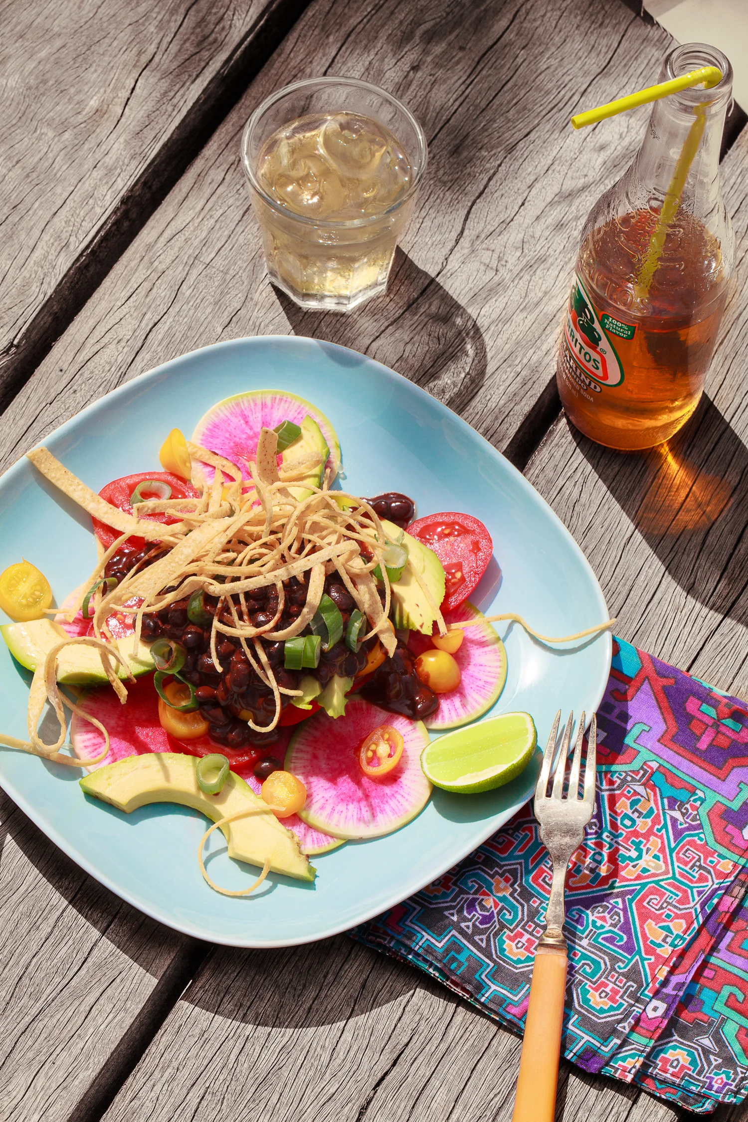 Black Bean Salad with Chocolate Vinaigrette. Blue plate from Ikea. Napkin made by my partners mother Maggie. Recipe and styling by Cle-ann, photo by Hugh Adams.
