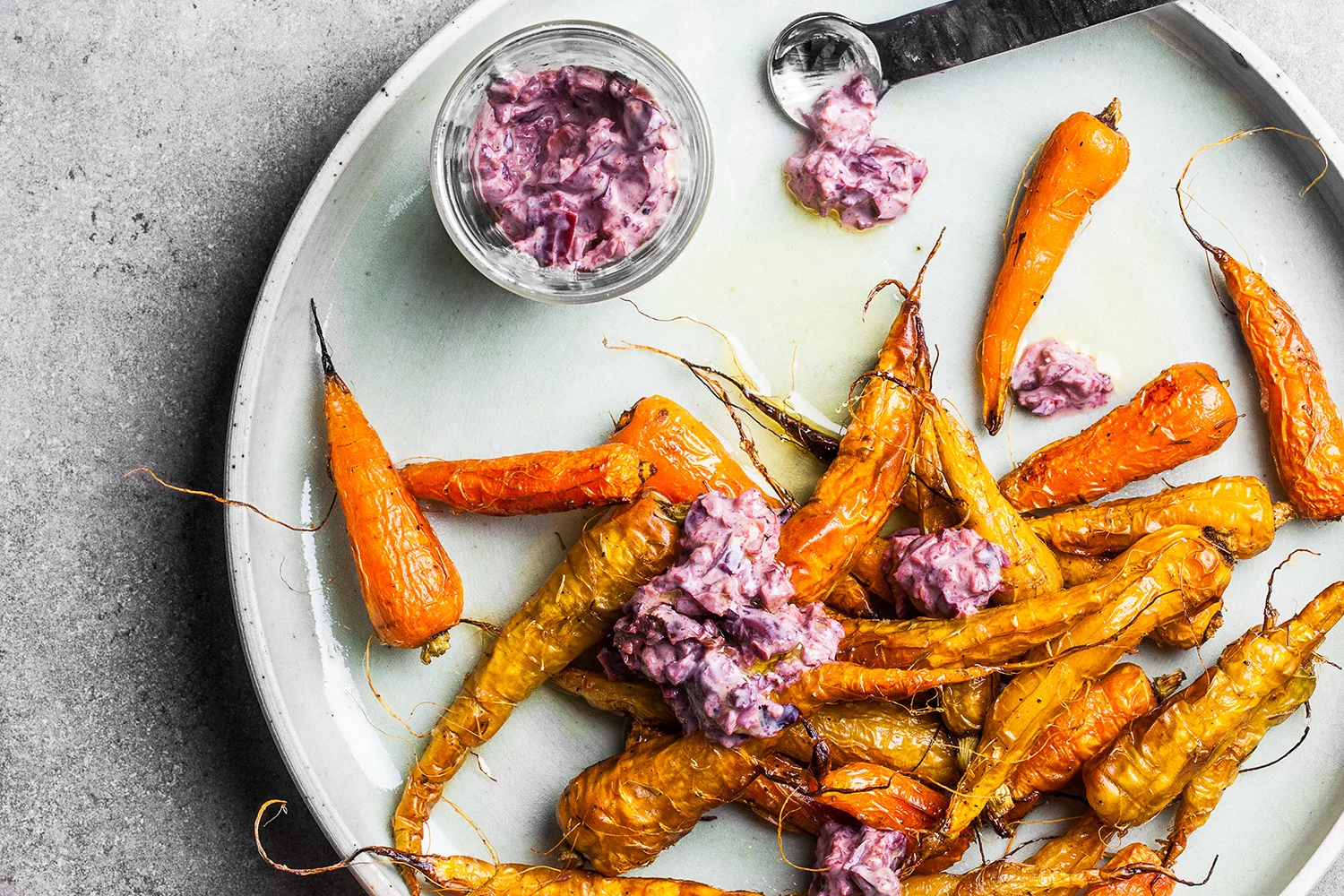 Roasted Carrots w/ Kalamata Olive Sauce. Recipe and styling by Cle-ann, photo by Hugh Adams.